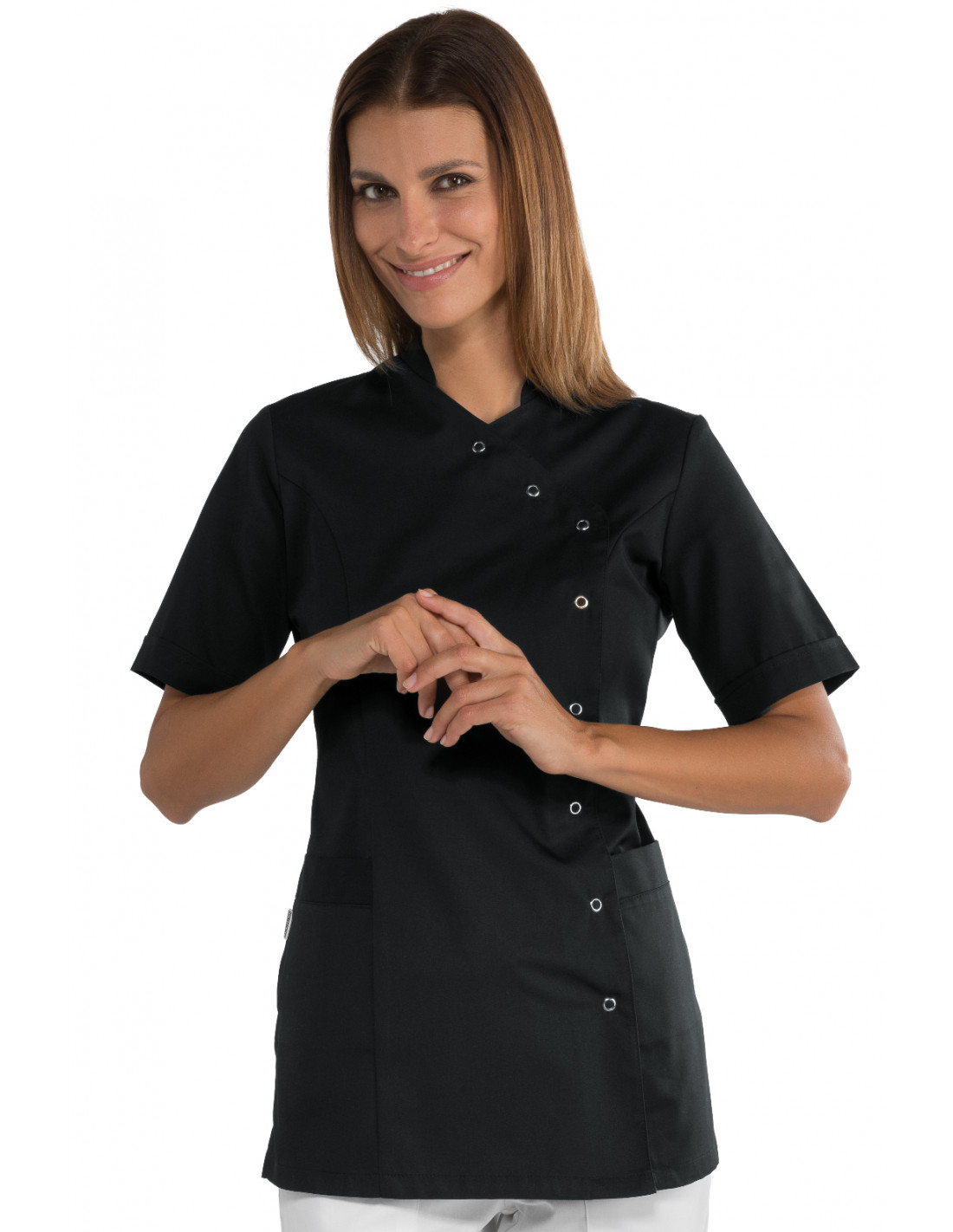La casacca Nizza è una camicia da donna con bottoni a mezza manica nero. Per settore medicale, estetico e sanitario. Ideale come divisa da lavoro per medico ed infermiere. Collo alla coreana, con 2 tasche e allacciatura laterale.