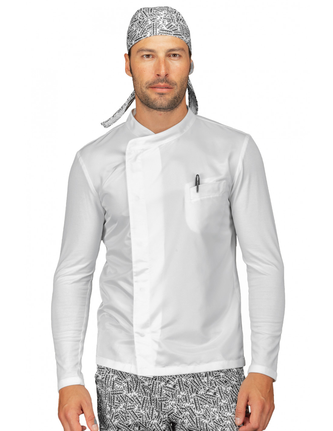 La Giacca Franklin unisex a manica lunga bianco. Ideale come divisa per uomo e donna da chef in cucina, ristorante o catering. Allacciatura asimmetrica con bottoni a pressione. Con taschino sul petto.