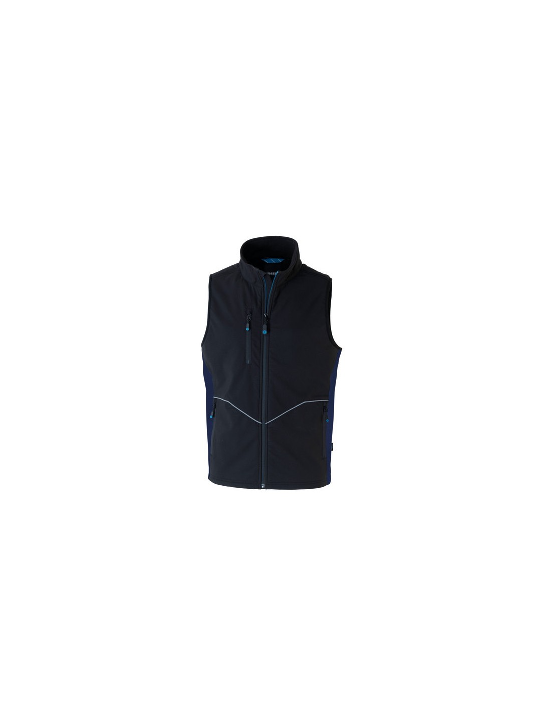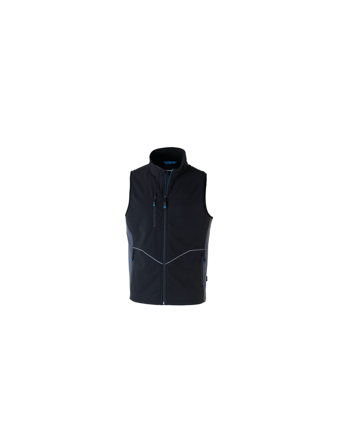 Tessuto resistente e durevole in Ripstop sul davanti, collo e spalle. Parte posteriore in softshell a tre strati. Tasche inferiori e taschino al petto chiusi con zip, una tasca interna chiusa con velcro, dettagli rifrangenti, travette e cuciture di rinforzo.