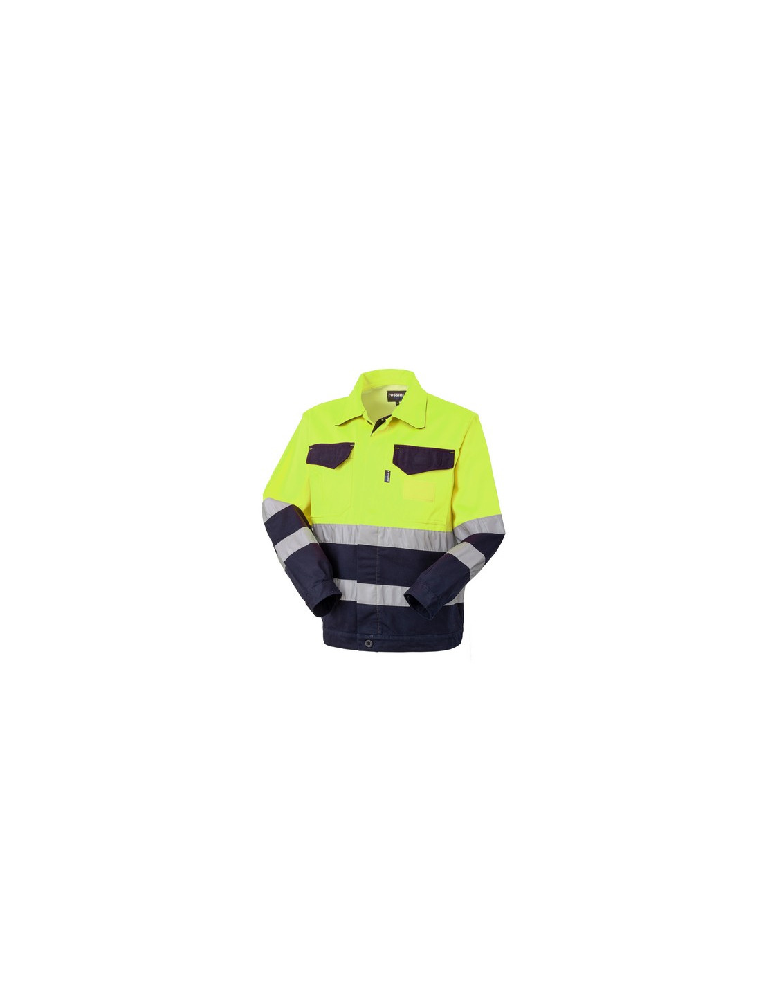 Giubbetto alta visibilità bicolore invernale con chiusura anteriore con bottoni coperti e collo a camicia. Due tasche applicate al petto, di cui la destra con portapenne e la sinistra con velcro per applicazione porta badge, chiuse con aletta di colore a contrasto e punto velcro Doppia banda rifrangente applicata al giro torace e al giromanica con inserti di colore a contrasto, polsi regolabili con velcro.
