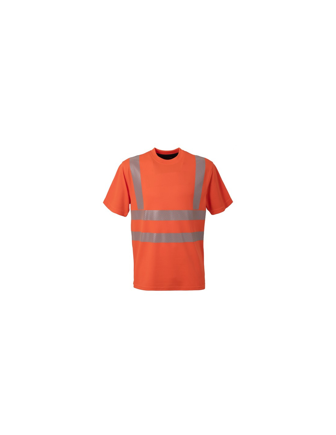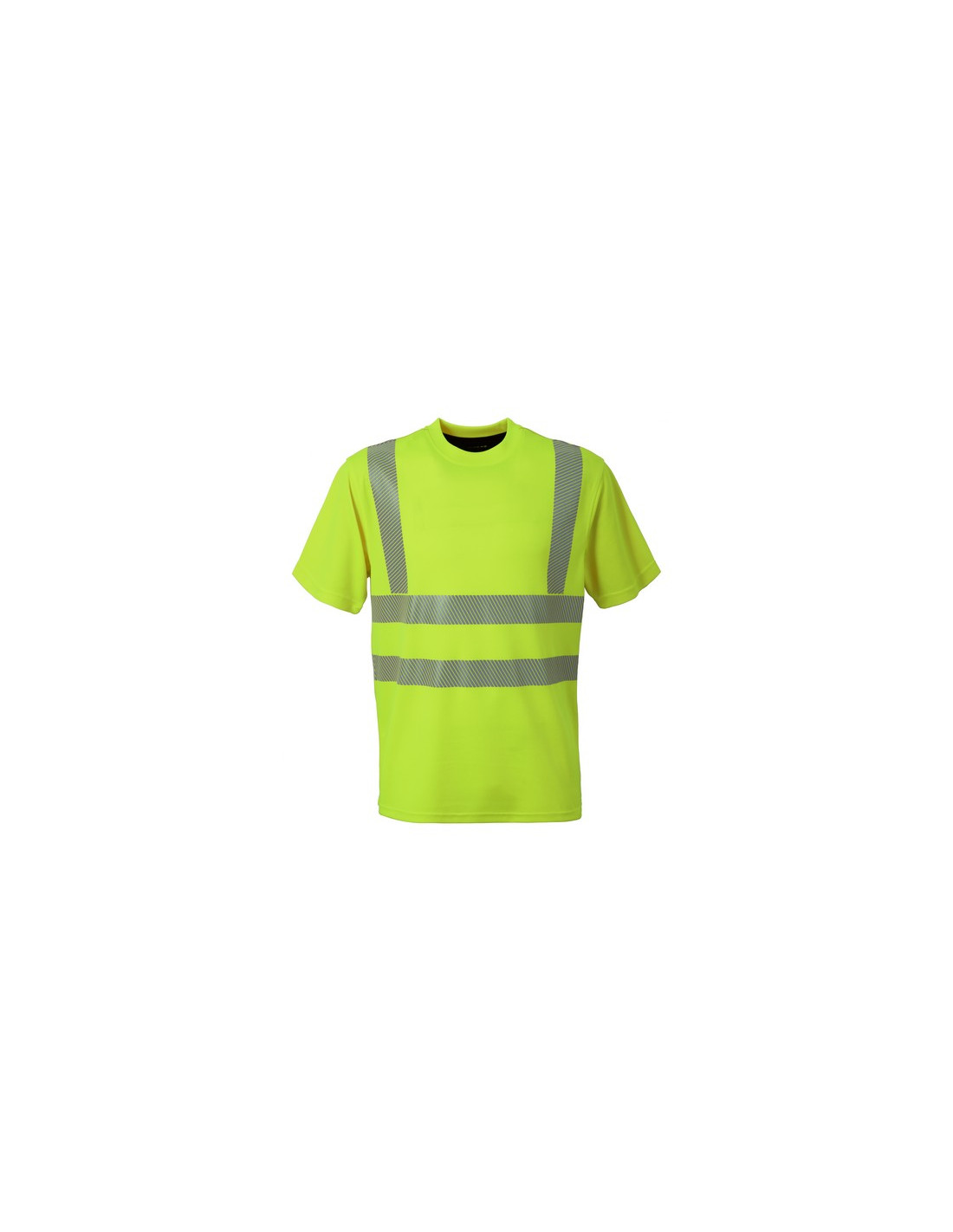 T-shirt mezza manica alta visibilità con fascia parasudore e lunetta di colore a contrasto nella parte posteriore del collo, girocollo a costine. Doppie bande rifrangenti stampate a transfer in vita e sulle spalle con pattern diagonale per conferire il massimo comfort a chi la indossa.