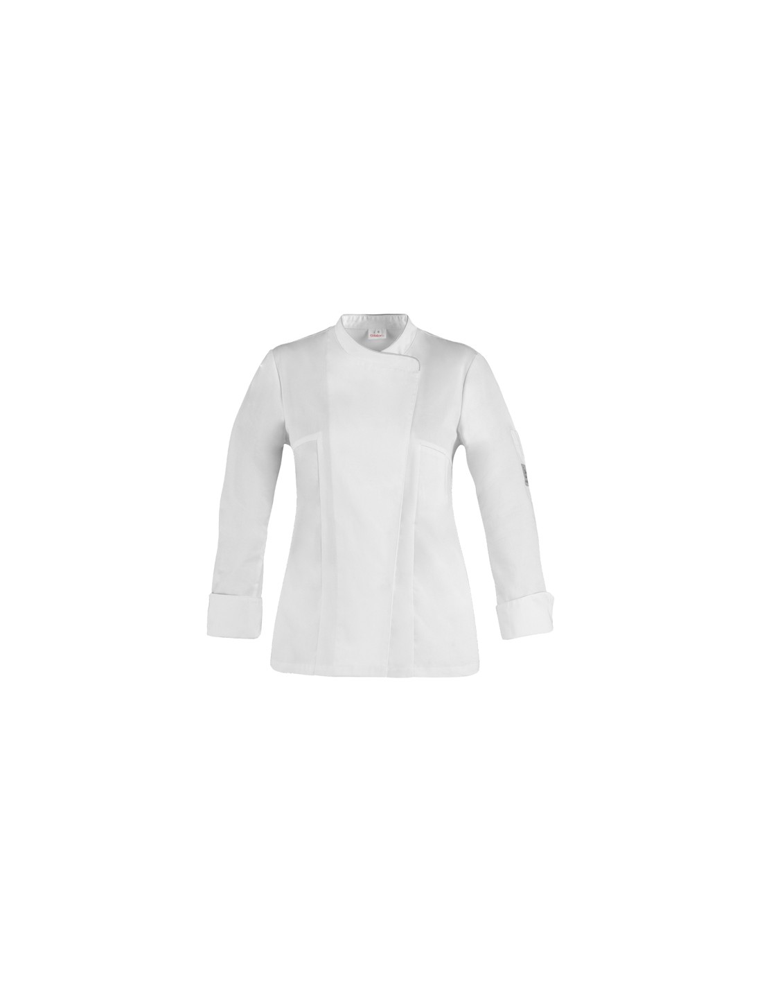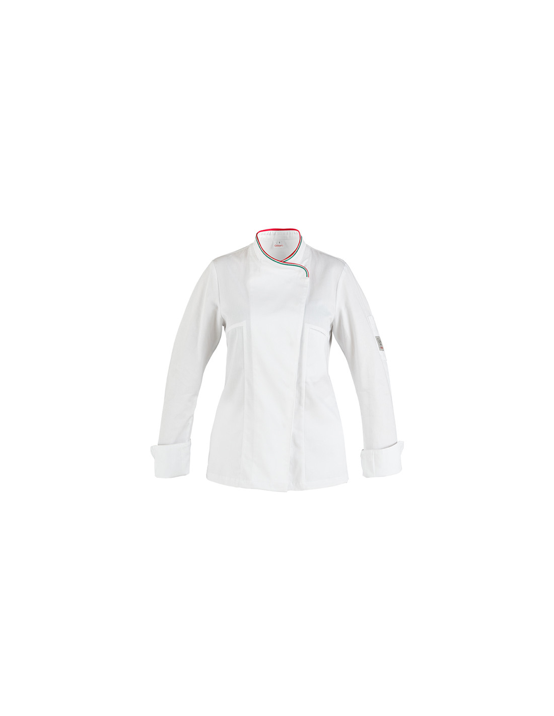 La giacca Susi è un capo dall’impronta classica, rivisitato in chiave contemporanea, grazie ai due tagli laterali in maglia di piquet, che sagomano il retro, conferendo alla giacca una vestibilità Slim Fit e assicurando il massimo confort nei movimenti. Il capo presenta il collo alla francese, l’abbottonatura rigorosamente nascosta, il taschino sul petto e il portapenne sulla manica. Nel collo è inserito il classico piping. Susi è proposta in bianco con piping grigio perla o tricolore, e in nero con piping grigio perla, e ha la sua variante maschile nella giacca Patrizio.