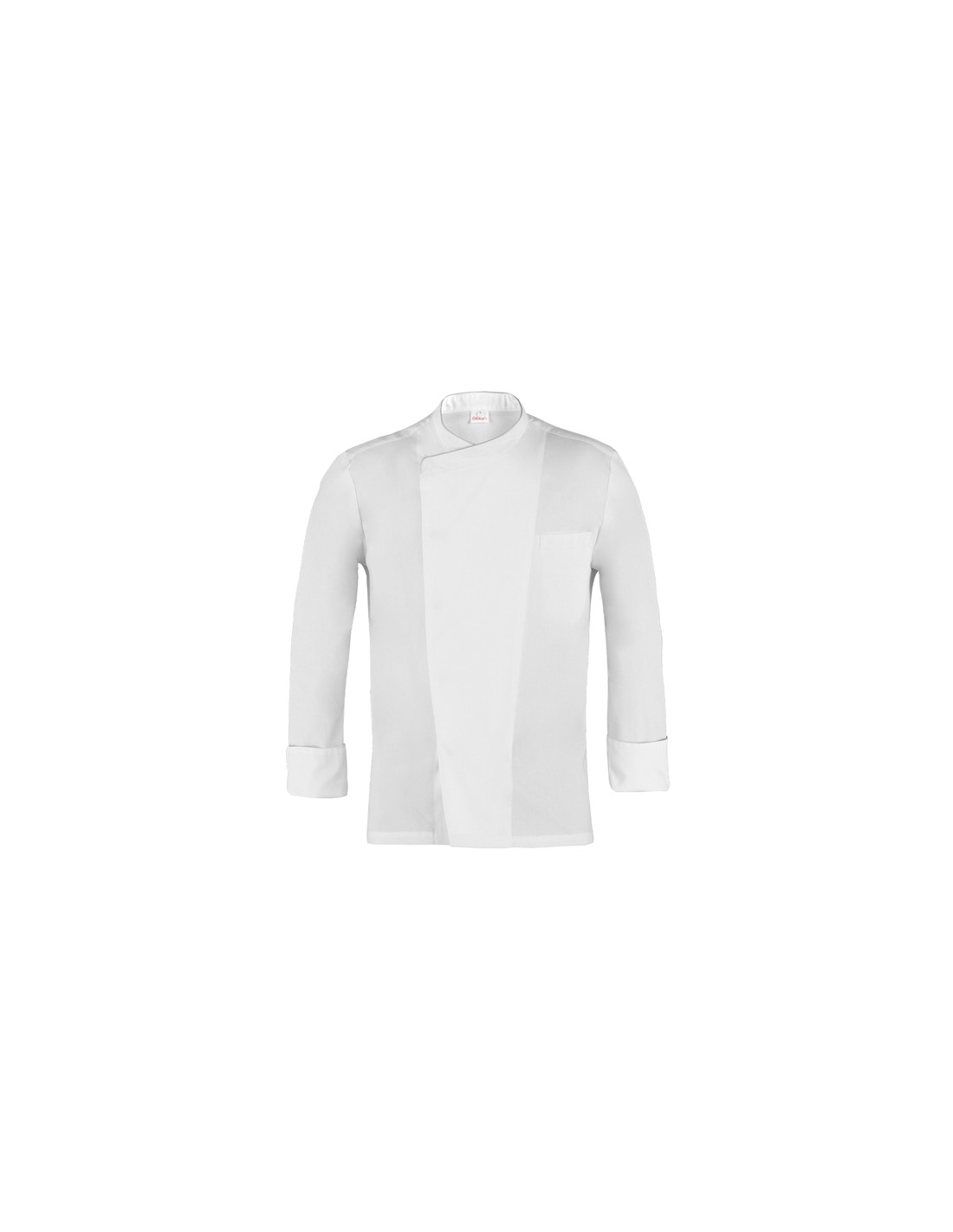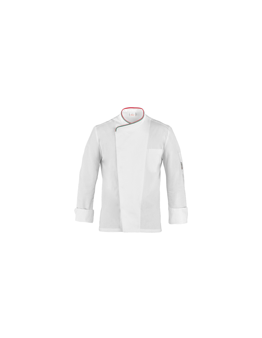 La giacca Patrizio è un capo dall’impronta classica, rivisitato in chiave contemporanea, grazie ai due tagli laterali in maglia di piquet, che sagomano il retro, conferendo alla giacca una vestibilità Slim Fit e assicurando il massimo confort nei movimenti. Il capo presenta il collo alla francese, l’abbottonatura rigorosamente nascosta, il taschino sul petto e il portapenne sulla manica. Nel collo è inserito il classico piping. Patrizio è proposta in bianco con piping grigio perla o tricolore, e in nero con piping grigio perla e ha la sua variante femminile nella giacca Susi.
