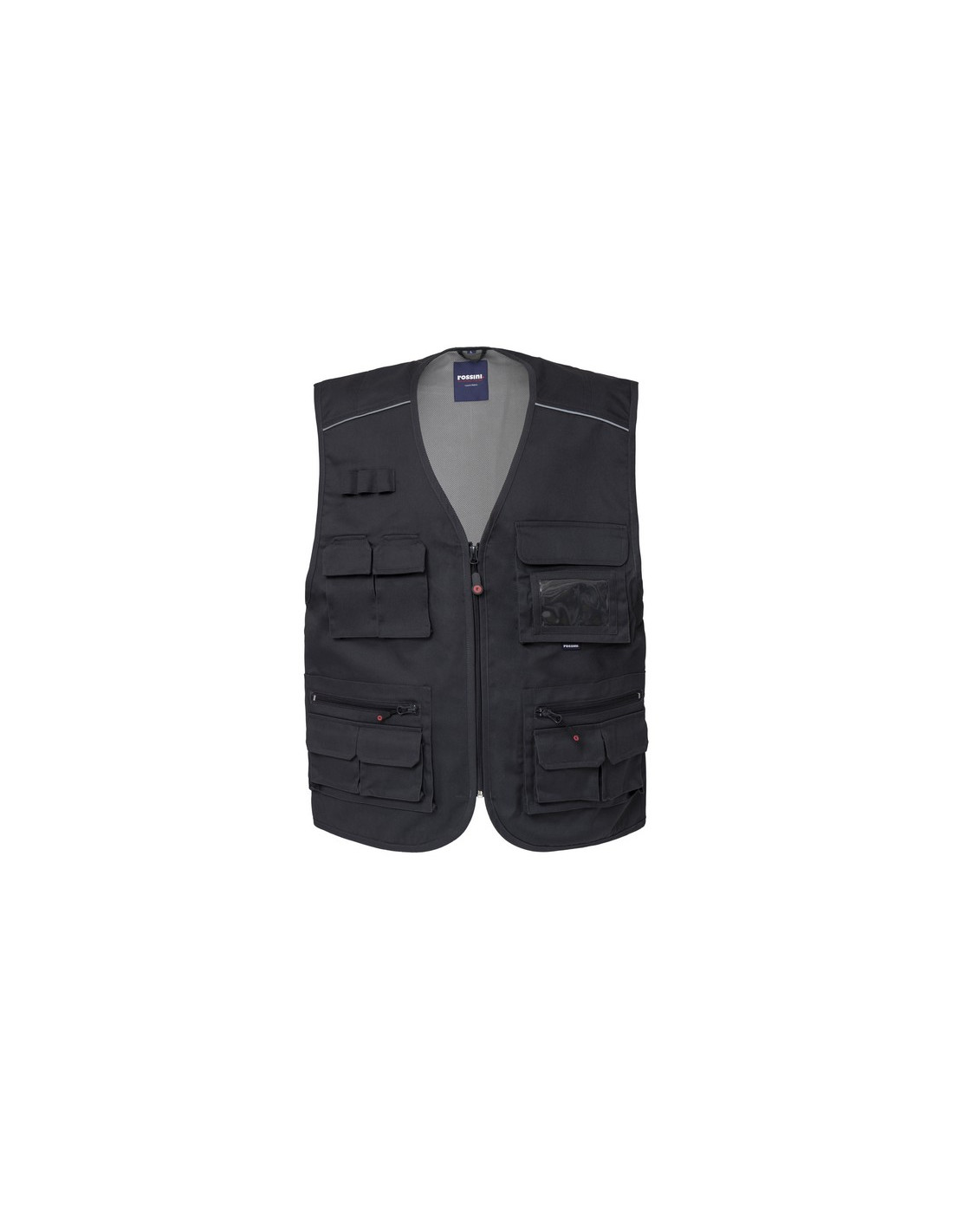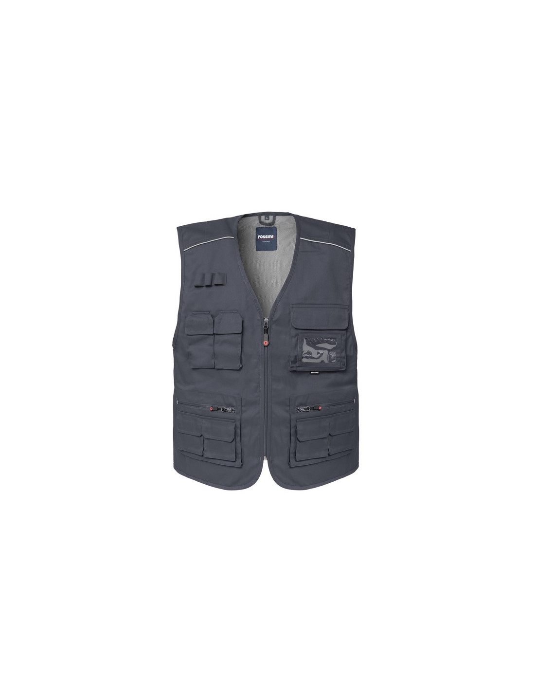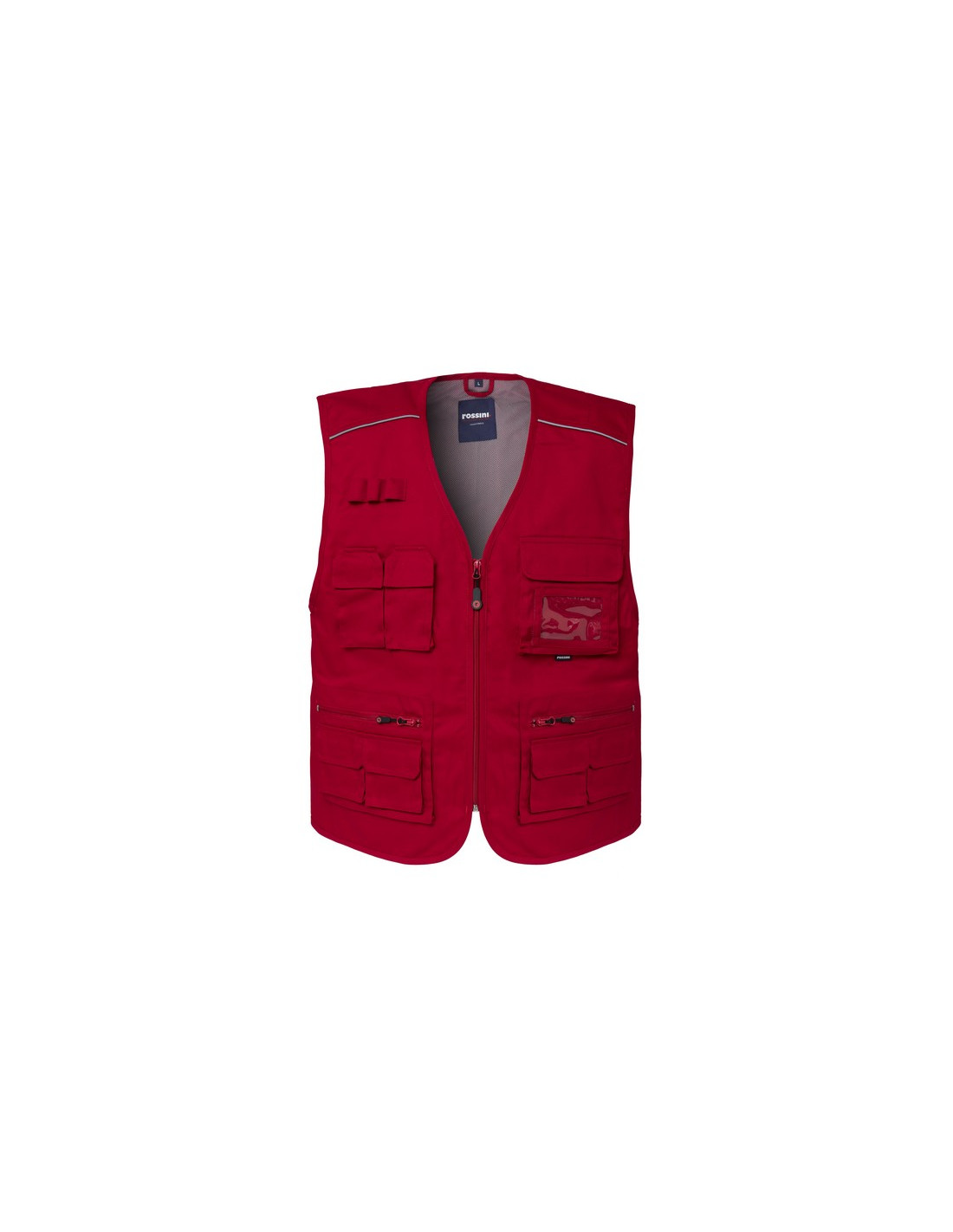 Gilet estivo con chiusura anteriore con cerniera, carré anteriore con profilo rifrangente a contrasto. Due taschini con soffietto chiusi con aletta e velcro, taschino applicato al petto con soffietto chiuso con aletta e velcro, portabadge in PVC chiuso con velcro applicato sul taschino, portapenna a tre scomparti. Due piccoli taschini con soffietto chiusi con aletta e velcro, due tasconi con soffietto chiusi con cerniera.