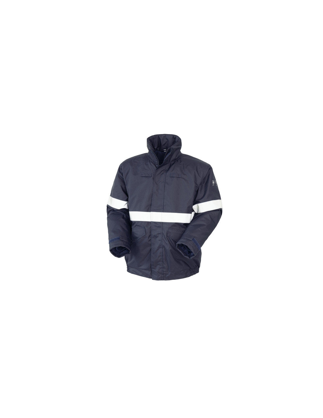 Giubbotto imbottito con chiusura centrale con zip coperta da coprizip chiuso con punti velcro, collo alto, cappuccio regolabile da coulisse richiudibile nel collo con chiusura in velcro. Gancio porta radio al petto. Etichetta interna con registro numero lavaggi e dati personali, un taschino a filetto chiuso con punto velcro nella parte interna del petto sinistro, polso regolabile con velcro. Due tasconi inferiori coperti da aletta, polso interno elasticizzato per maggiore comfort e protezione. Strisce rifrangenti anteriori e posteriori.