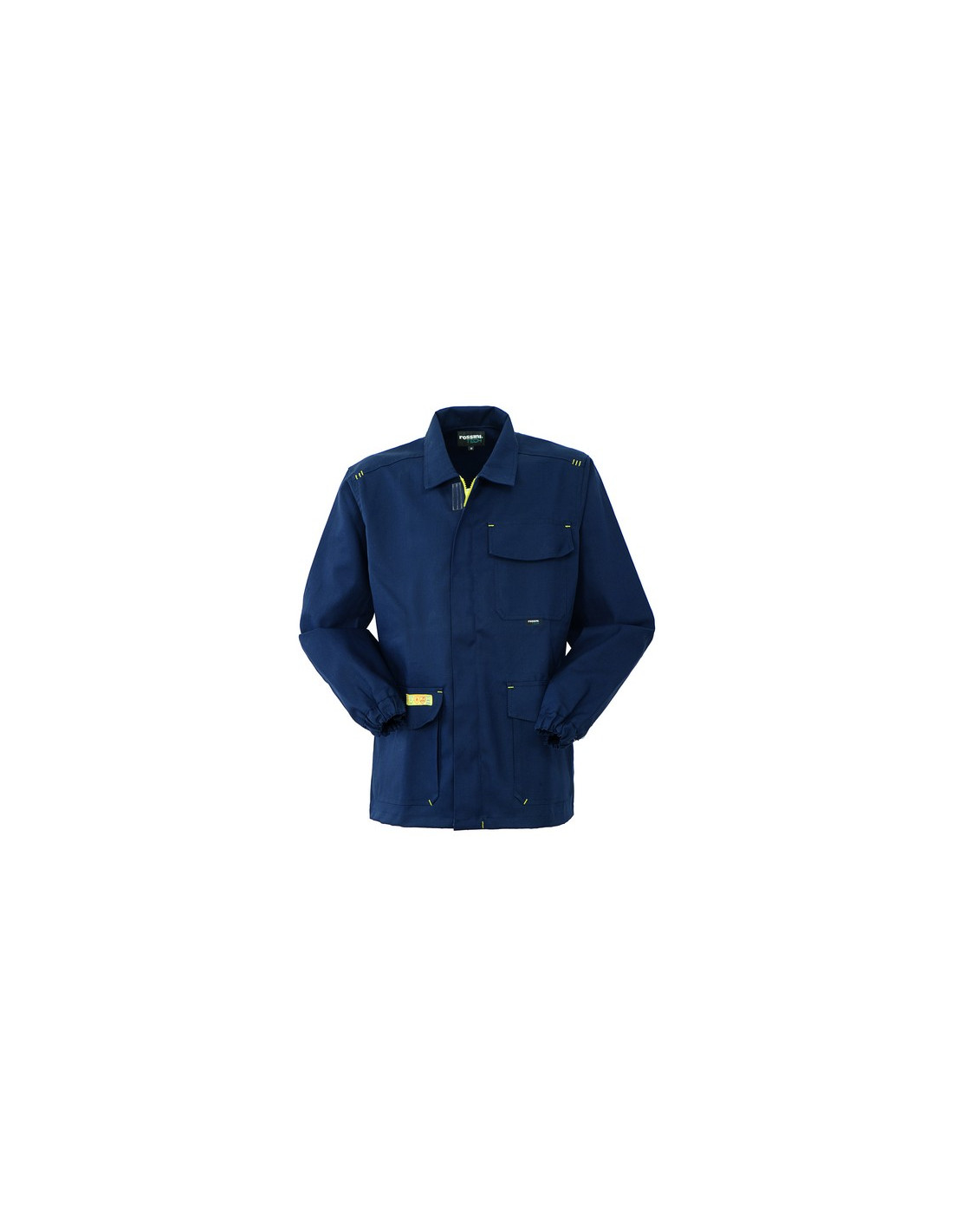 Giacca da lavoro con chiusura anteriore con zip centrale coperta da patella chiusa con punti velcro. Un taschino applicato al petto chiuso con aletta e velcro, due tasche inferiori applicate chiuse con aletta e velcro con soffietto laterale interno. Etichetta jacquard con pittogrammi cucita, polsini a fondo manica con elastico, carré posteriore, travette varie di colore giallo.
