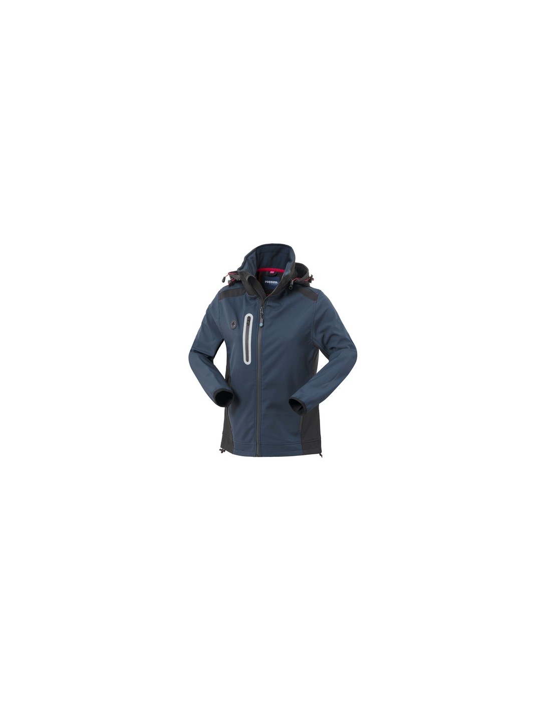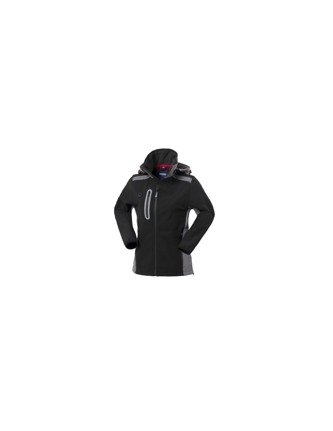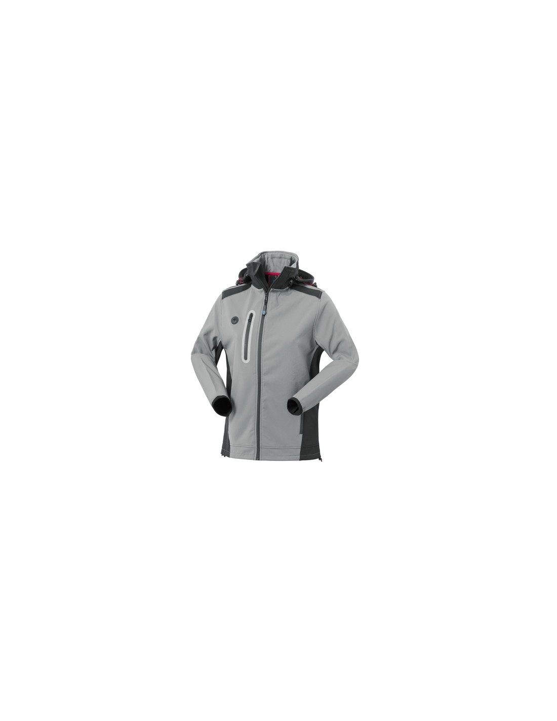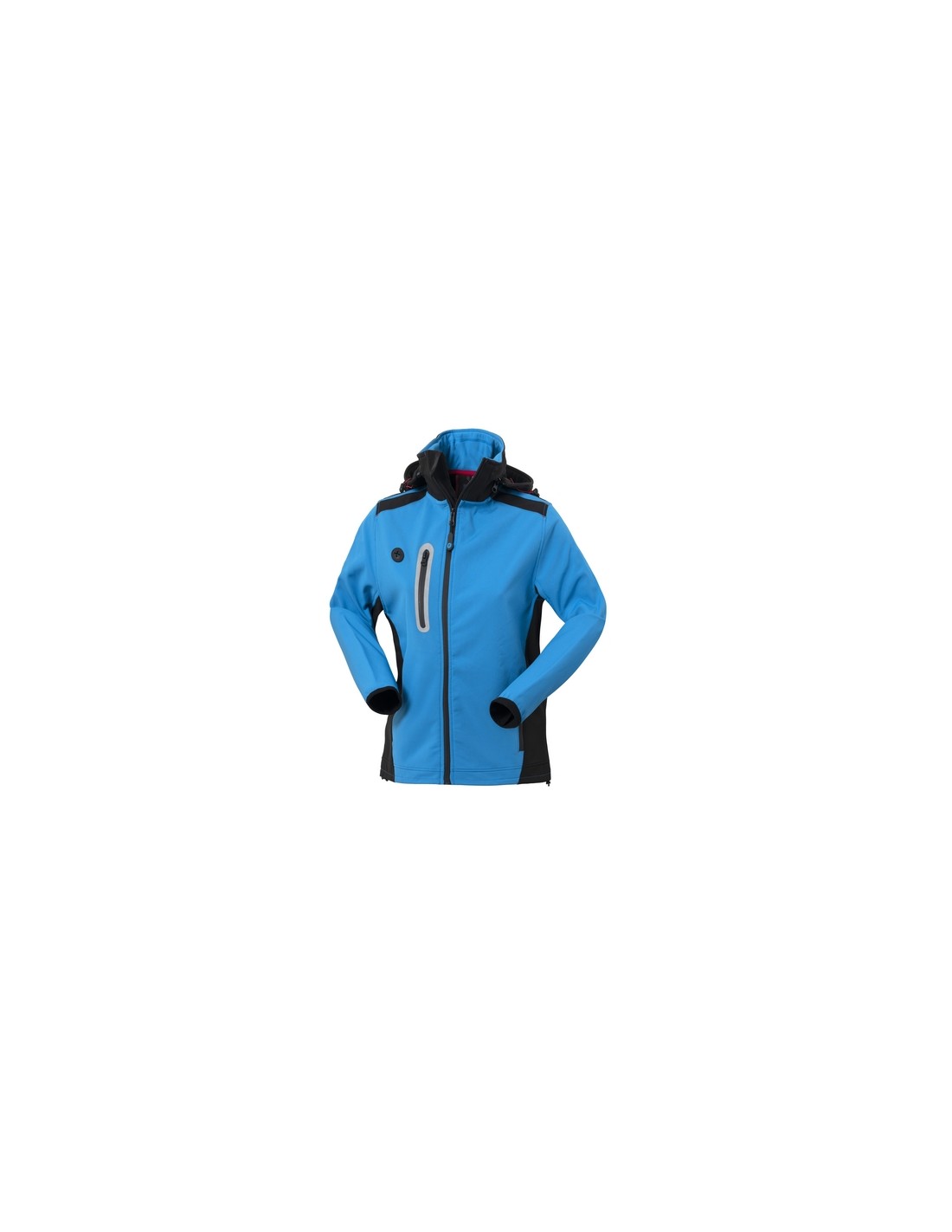 Giubbotto da donna realizzato in tessuto Softshell a tre strati, chiusura anteriore con zip waterproof, cappuccio staccabile con zip e coulisse, pratico foro in silicone per cuffie. Un taschino a filetto al petto destro chiuso con zip waterproof verticale e profilo rifrangente, due tasche inferiori a filetto chiuse con zip waterproof, carré e foro di aerazione su schiena, polsi profilati con bordo elastico, inserti di colore a contrasto.