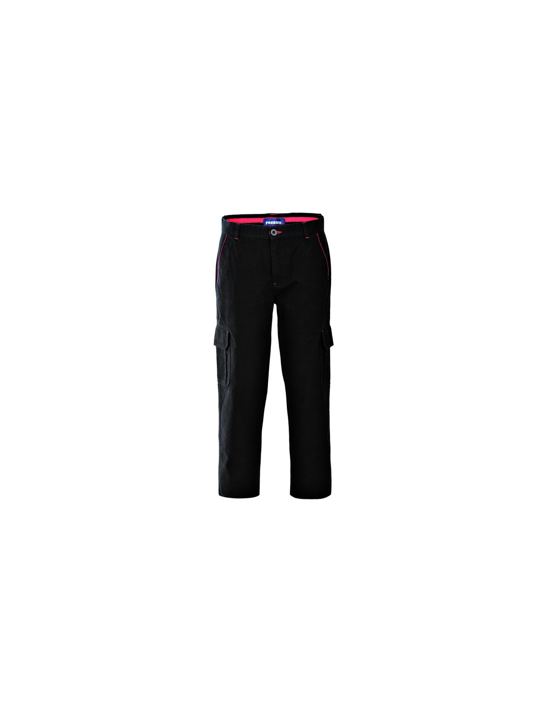 Pantalone da lavoro con elastico ai fianchi interno regolabile, chiusura alla patta con cerniera e bottone in cintura, travette varie di colore rosso. Due tasconi laterali con soffietto centrale chiusi con aletta e punti velcro, due tasche anteriori interne con cucitura di colore rosso, una tasca posteriore applicata a destra chiusa con aletta e punti velcro, una tasca posteriore applicata a sinistra chiusa con bottone tradizionale.