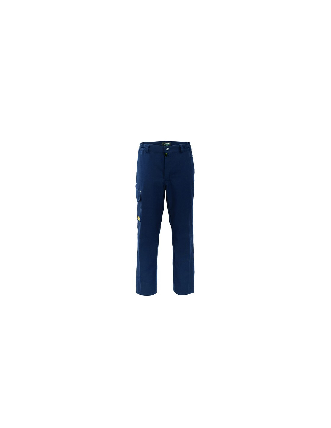 Pantalone da lavoro con chiusura alla patta con zip e bottone automatico nascosto, passanti in vita ed elastico ai fianchi. Due tasche anteriori interne, tasca posteriore applicata a destra chiusa con aletta e velcro, tascone laterale chiuso con aletta e velcro applicato su gamba destra. Etichetta jacquard con pittogrammi cucita sul tascone, travette varie di colore giallo.